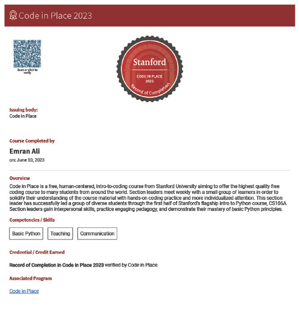_XXParticipated as a Section Leader in Stanford’s global volunteer-driven Code in Place program, aimed at democratizing access to computer science education. The initiative involved guiding and supporting a small cohort of learners through Python programming fundamentals as part of Stanford's renowned CS106A course. The program combines human-centered teaching with scalable online learning, recruiting and training volunteer instructors worldwide to create an inclusive and engaging learning environment.Publications